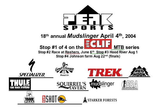 COST IS $10.00 FOR JUNIORS, $15.00 FOR BEGINNERS, 25.00 FOR SPORT, AND EXPERT/OPEN. A $5.00 late fee will be applied to all entrys received after March 29th. ONE DAY LICENSE AVAILABLE AT RACE in gym from OBRA official THE COURSE HAS SOME OF THE SAME TRAILS AND CLIMBS AS last YEARS MUDSLINGER BUT EVEN BETTER. Longer loop if dry. Shorter course if nasty weather. Don't want to kill you. RACE STARTS FROM THE SCHOOL NEUTRAL START 9:55 AM LINE UP. THIS COURSE IS FAST AND FUN! Awards at 2pm along with raffle. Parking along Blodgett Rd only. Parking people will guide you. MAKE CHECKS PAYABLE TO MUDSLINGER EVENTS AND SEND TO 91231 SHANE CT COBURG OR 97408 PLEASE FILL OUT THE OBRA WAIVER DOWNLOAD IT at OBRA.org/forms AND SEND IT TO ME. THIS WILL SAVE YOU TIME AT REGISTRATION, WHY FILL OUT TWO FORMS? Registration at Peak Sports 3-7pm Saturday April 3rd DAY OF RACE REGISTER AT THE SCHOOL 7am-9am daylight savings time applies set your clocks ahead CLASSES OFFERED: 4 TO MAKE CLASS, TROPHY TO 1ST PLACE, RAFFLE AND FOOD PROVIDED camping available in gym subject space available call for reservations. $5.00 per person donated to the school. Contact Mike for more info $400.00 minimum CASH PURSE To TOP 10 men and top 3 for the women