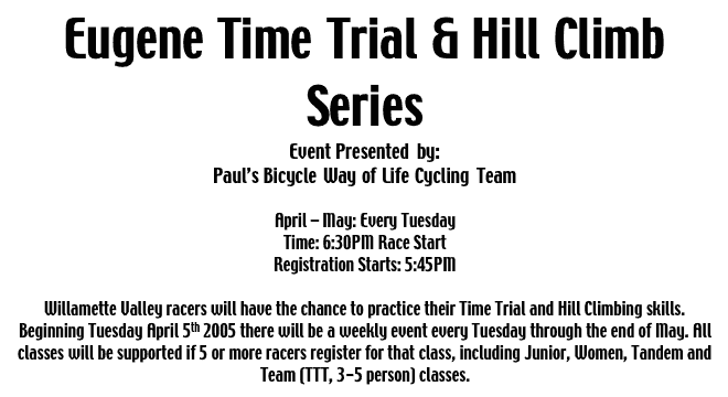 | Registration: 5:45PM-6:20PM (online at www.orbike.com) $8.00 per event or series option available. Series costs: $28 for the Time Trials (4 Events) or $35 for the Hill Climbs (5 Events) Make checks payable to "SWEET SPORTS" and send them to: Sweet Sports 1456 McKinley Court Eugene, OR, 97402 Start Time: 6:30PM-30 second starts-based on sign in. April TT: 15 mile flat TT course Staging at Coburg Elementary School May Hill Climb: 3.5 Mile climb, 800' Elevation gain. Staging at the Lutheran Church off Lorane Hwy at 85780 McBeth Rd. Time Trial Series April, 5th April, 12th (TTT option) April, 19th (TTT option) April, 26th (awards) Hill Climb Series May, 3rd May, 10th May, 17th May, 24th May, 31st (awards) Contact: Sweet Sports 541-334-6449 1456 McKinley Court, Eugene Or 97402 Prizes: Wheel Set, Time Trial Bar setup, Burley Design Trailer Plus: Gift Certificates, Tools, Computers, Tires, Clothing Prizes awarded after last event for the individual series at Track Town Pizza at 8:30 PM. |